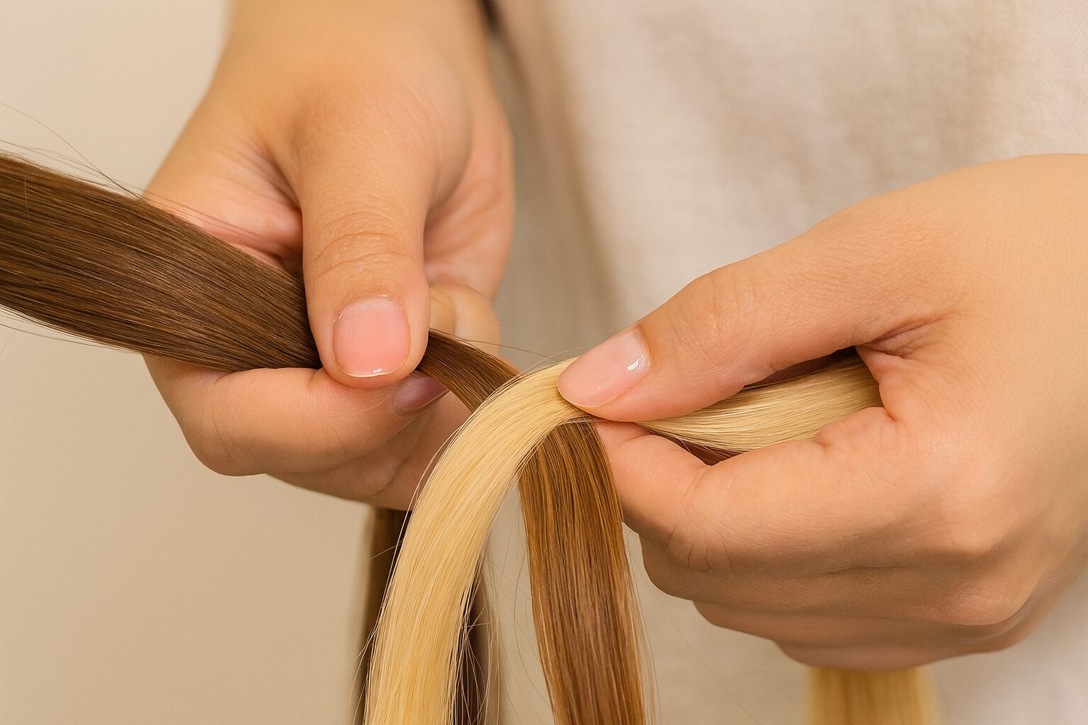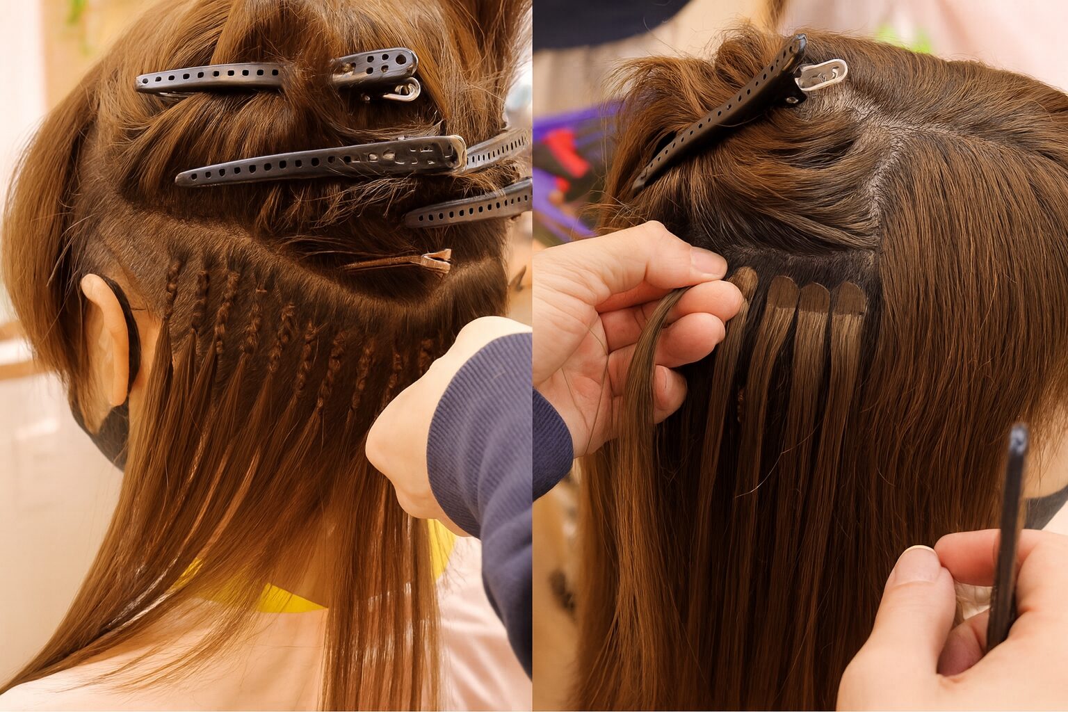 シールエクステを上から付けることで、膨らみを抑えながら編み込みと地毛の境界線をぼかし、自然な馴染みを実現します。