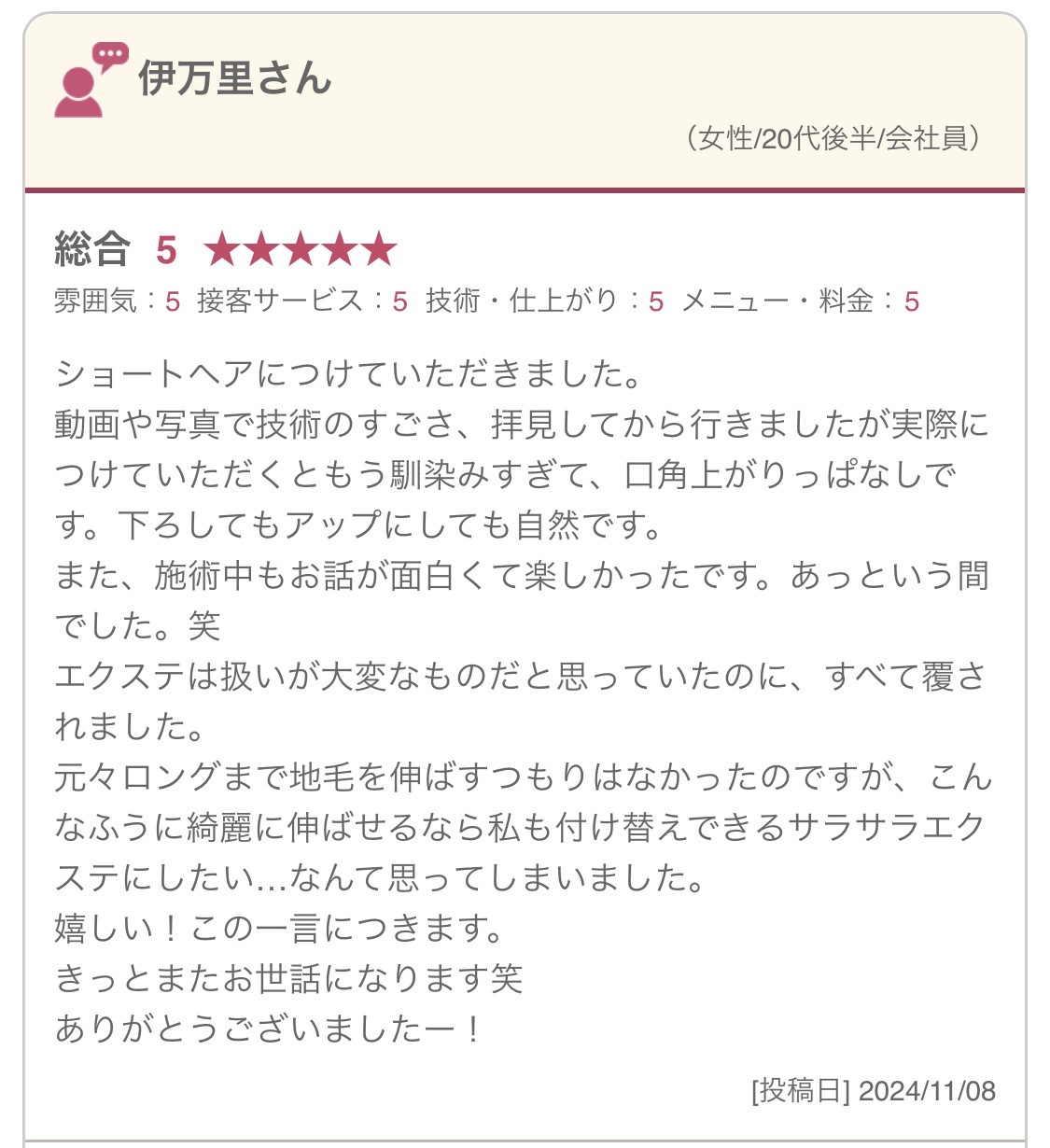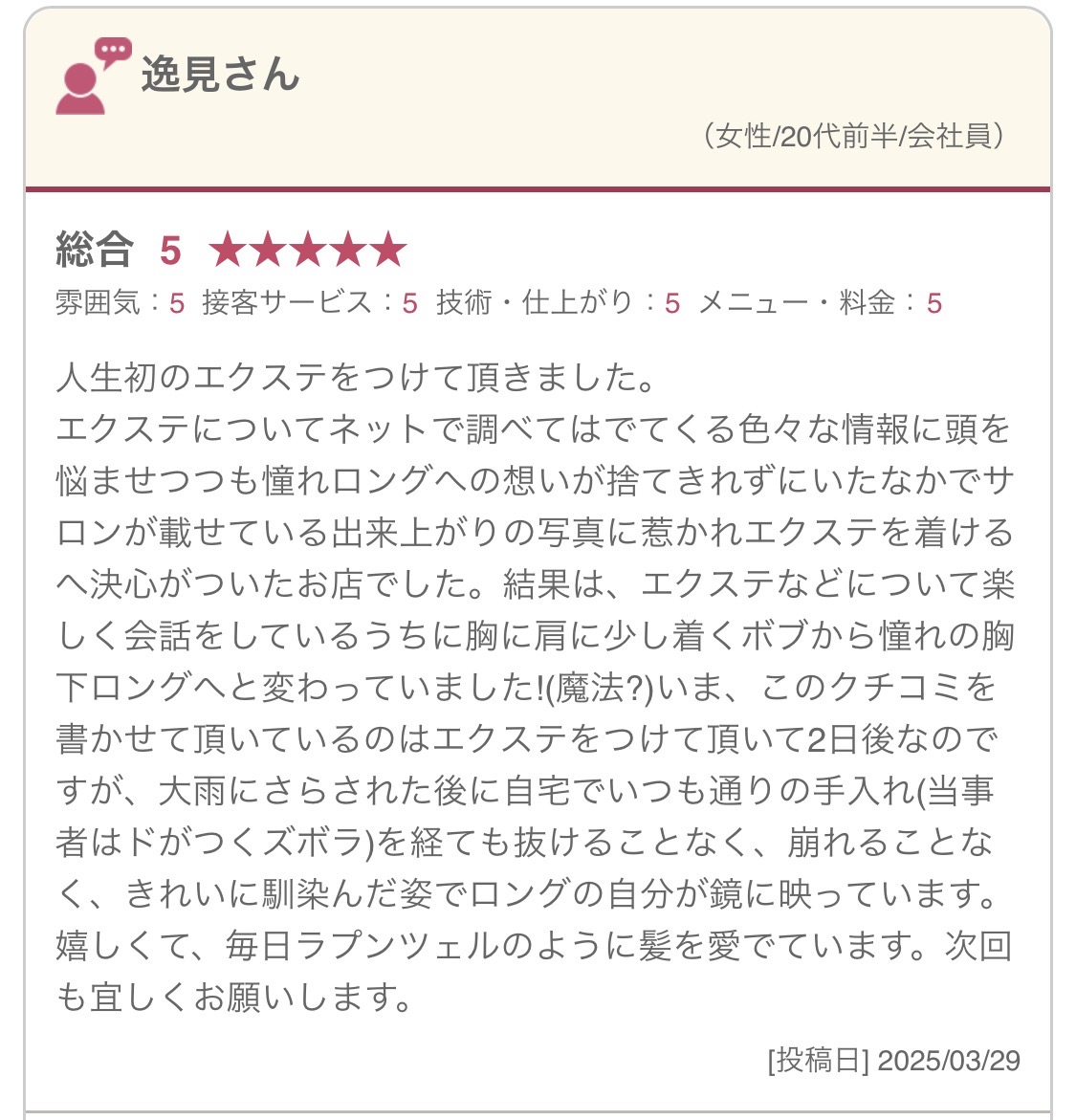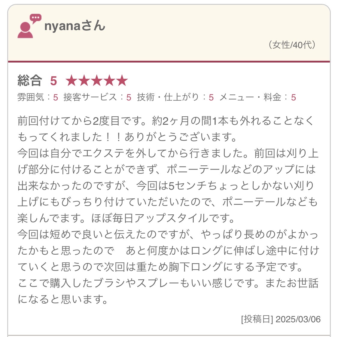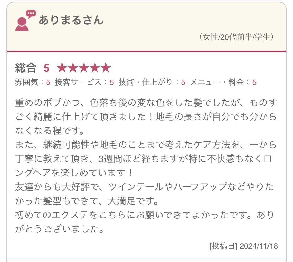 エクステを付けるお客様の多くは「地毛のロングを目指して伸ばし途中」の方々です。